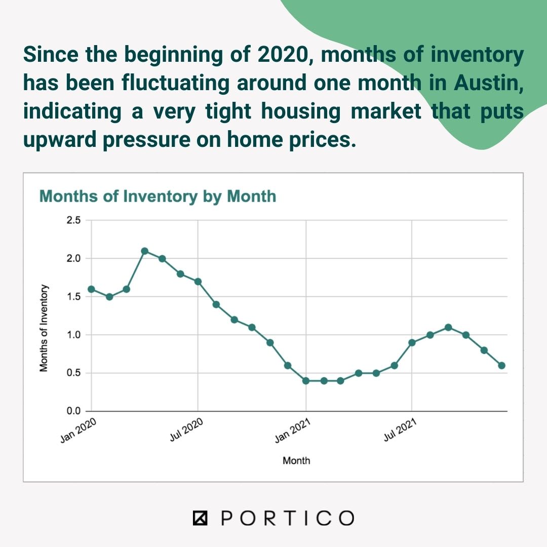 Another important metric to look at is Months of Inventory. Months of inventory is the current supply of homes offered for sale relative to the number of homes being purchased. The result indicates the number of months it would take to sell all properties currently for sale at the average monthly sales pace. At 6 months of inventory you have a balanced housing market. When inventory levels exceeds 7 months, housing demand is low and prices are likely to fall. When the inventory levels fall below 6 months, this is a sellers market where sellers have more control of price and terms. As the below graph shows, Austin has been in a strong sellers market for the last few years with December 2021 going as low as 0.6 months.