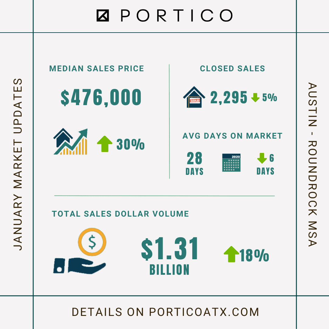 January has been another busy month for real estate in Austin. While the number of new listings has dipped for the Austin-Round Rock MSA, the median sales price has increase by 30% and average days on the market have decreased by 6 days compared to January 2021.